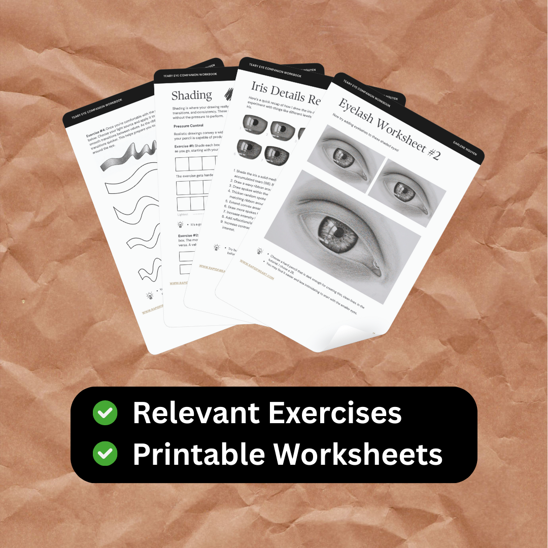 Instead of redrawing the entire eye every time you want to practice one challenging section, you can focus on specific skills using the included printable exercises and worksheets, featuring high-quality images of the exact eye drawing from the tutorial.